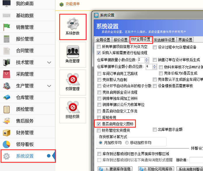 2.打开软件--系统设置--系统参数--ERP全局设置--是否启用自定义图标
